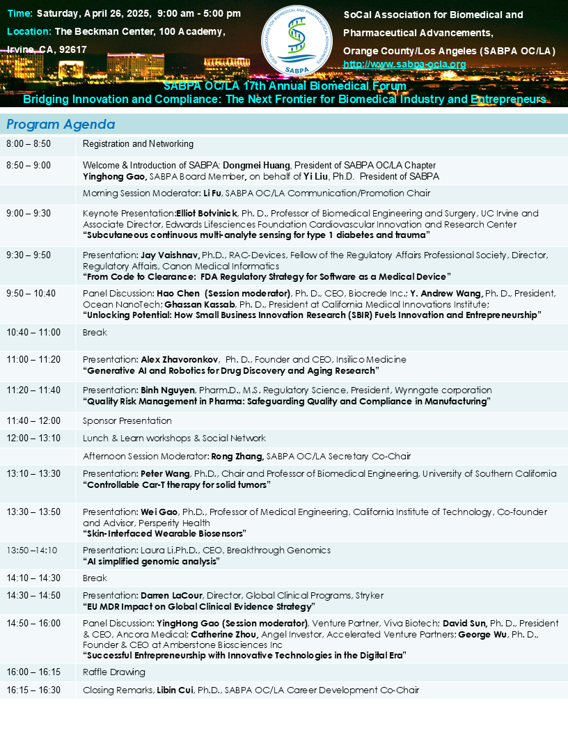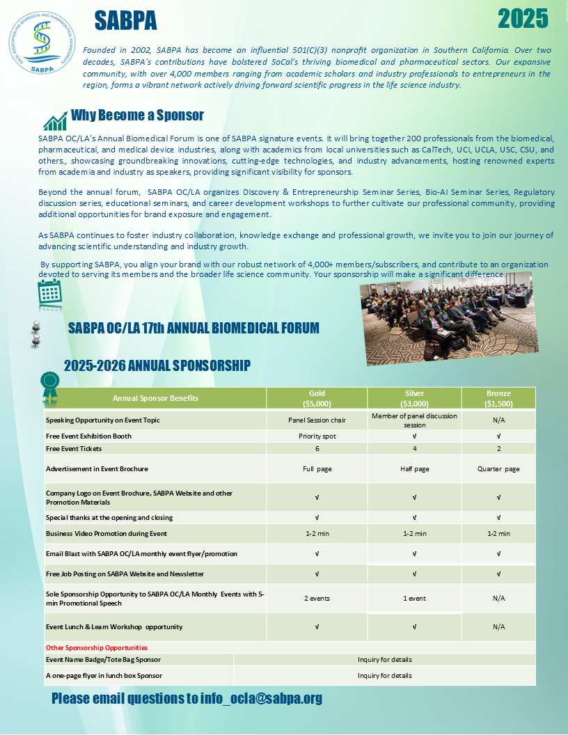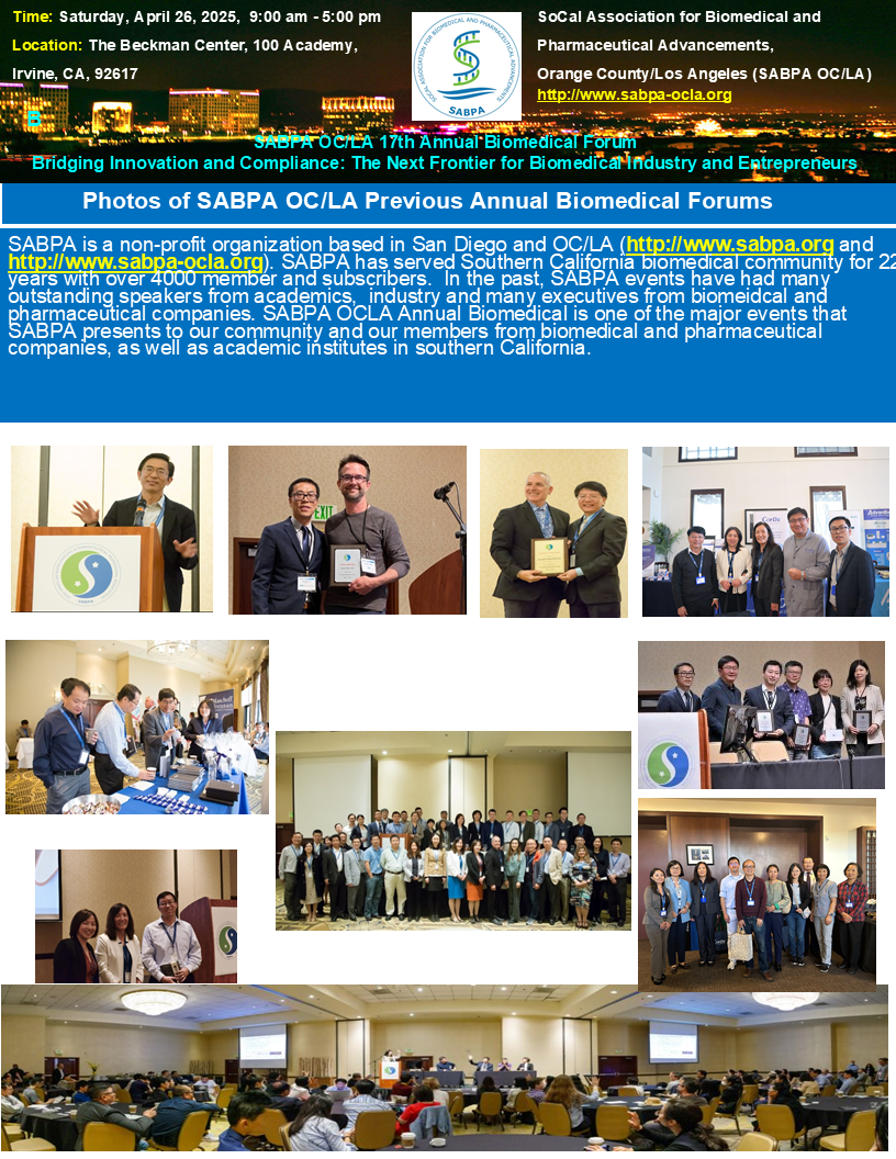 This exciting forum by SABPA OC/LA will bring you the latest innovations in biomedical industries, cutting-edge developments of pharmaceuticals and medical devices, entrepreneurship, and career development. We aim to provide an attractive platform to promote life sciences and biotechnology, connect entrepreneurs, scientists, investors and students, and stimulate alliances across biomedical industries in SoCal area and beyond. Join us for the exciting learning and networking opportunities!