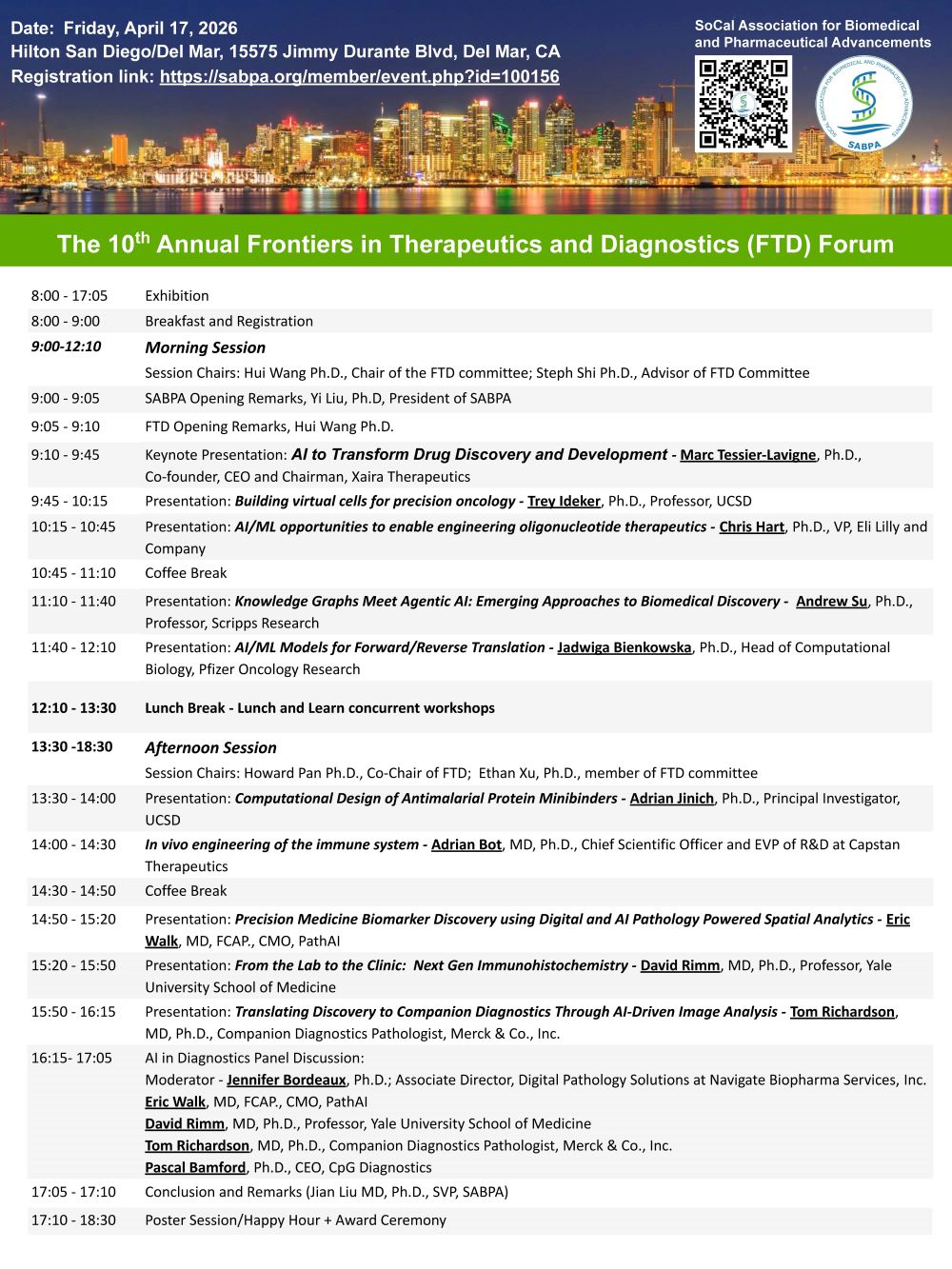 SABPA proudly presents the 2026 FTD Forum, showcasing the transformative impact of artificial intelligence (AI) across drug discovery, advanced therapeutics, and precision diagnostics.